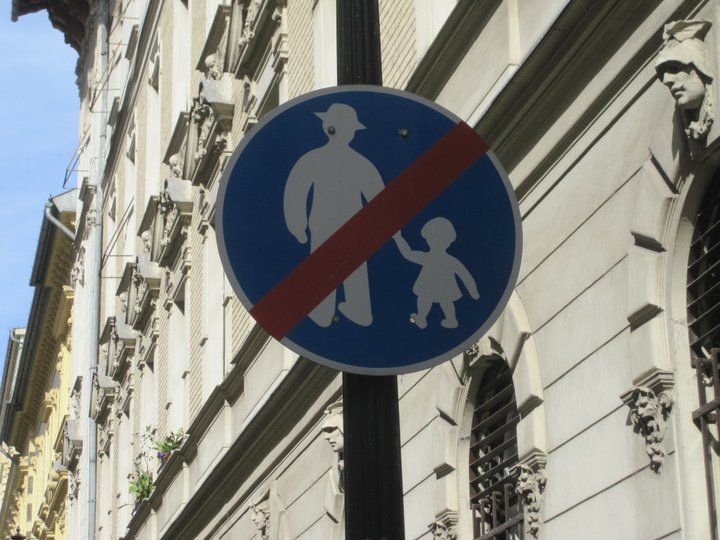 First thought was “No Pedophile Zone” but on closer examination, it seems the red bar was added by some wag to a sign announcing a pedestrian walkway for men in derbies and their squatty spawn.