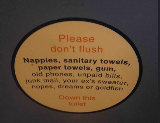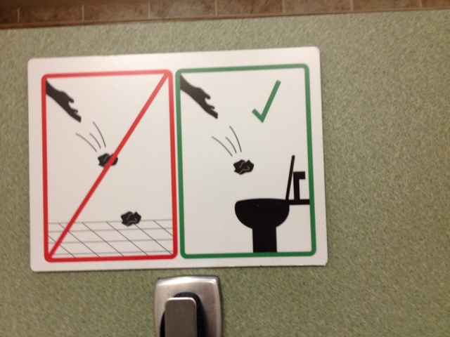Below are two conflicting directions on public restroom manners. One is it from England (note the word Nappies) and the other is from America’s heartland, Salt Lake City, Utah. England’s admonishment shows a lack of confidence in their plumbing while America says Bring it on! ’cause, what the hell, we don’t want to pick any crap up off the floor.