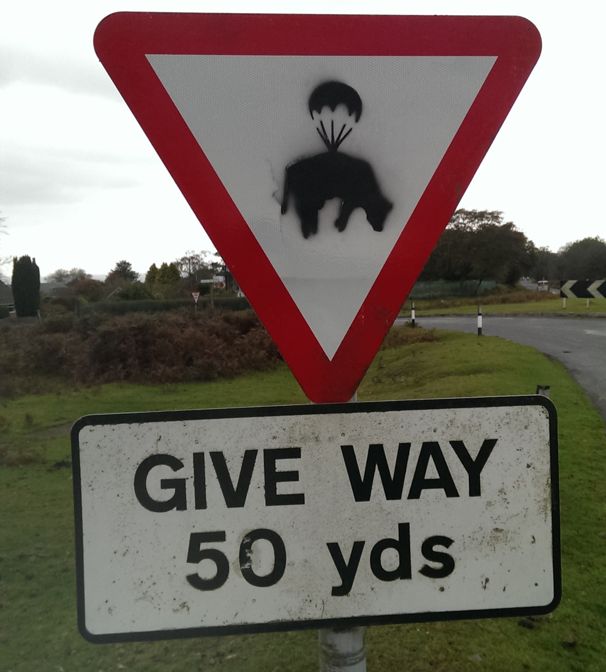 What image the parachuting cows is hiding in the Give Way sign I can only imagine. Chickens on roller skates? Bike riding pigs? Tourists on Segways?