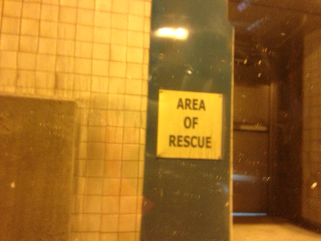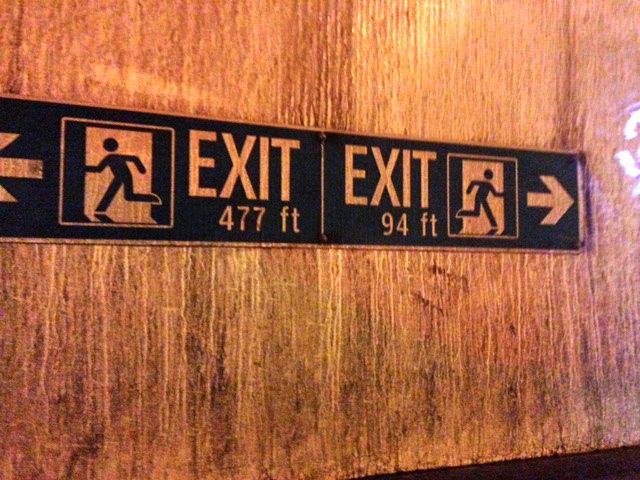 In Pittsburgh, we spruced up our tunnels, meaning we added lighting that is permanently set on Extra Grim and transformed the soot blackened walls into soot smeared walls. Plus we added helpful signs like the one below, which offers the option of running either 477 or 94 feet for dear sweet life. Dasher’s choice!